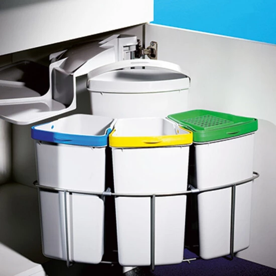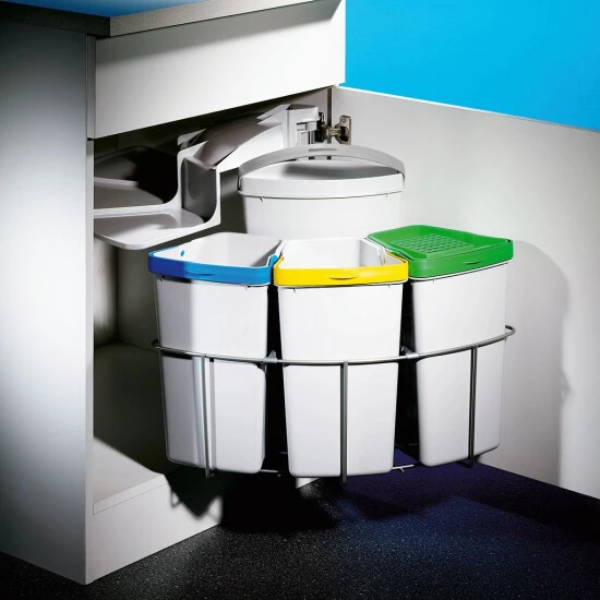 Komplett mitDeckel und 4 Aktivkohlefiltern (ca. Jahresbedarf), Abfallvolumen 39 (3 x 9/1 x 12) Liter, Technik: Schwenktechnik, Griff gelb/grün/grau/blau, Montage: Schrankboden/-wand