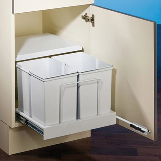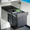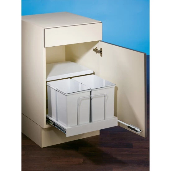Abfallvolumen 30 (2 x 15) Liter, Technik: Vollauszug, Montage: Schrankboden, inkl. Mitnehmer, deswegen andere Schrankbreite notwendig, mit nur 340 mm Einbauhöhe der ideale Raumsparer, nur 360 mm Einbautiefe, es wird ein Türöffnungswinkel von 110° benötigt