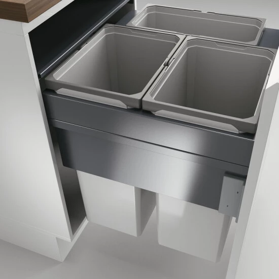 Führungsschienentiefe 510 mm, Abfallvolumen 91 (2 x 35/1 x 21) Liter, Technik: Überauszug, Gestell/Führung silber, Gesamtdeckel silber, Montage: Schrankwand und Frontblende, mit Softeinzug und Dämpfung