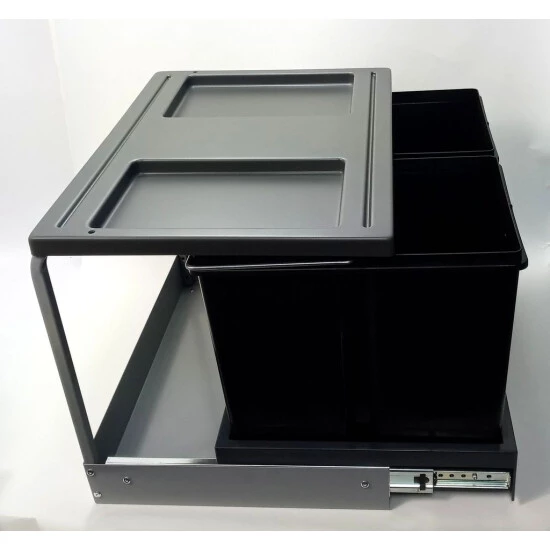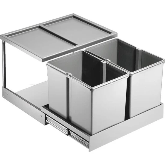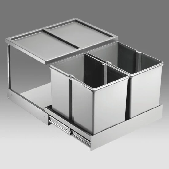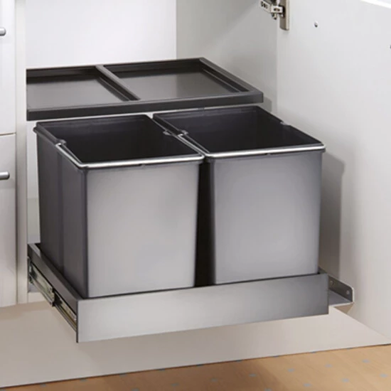 Abfallvolumen 30 (2 x 15) Liter, Technik: Vollauszug, Montage: Schrankboden, komplett mit Mitnehmer für Drehtüren, es wird ein Türöffnungswinkel von 110° benötigt, mit nur 335 mm Einbauhöhe der ideale Raumsparer
