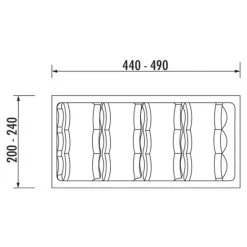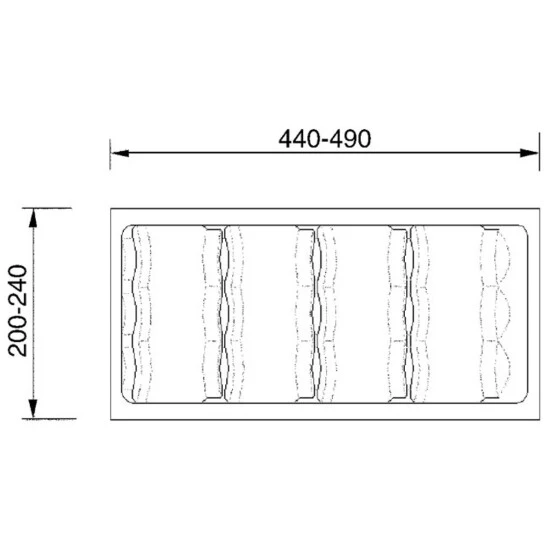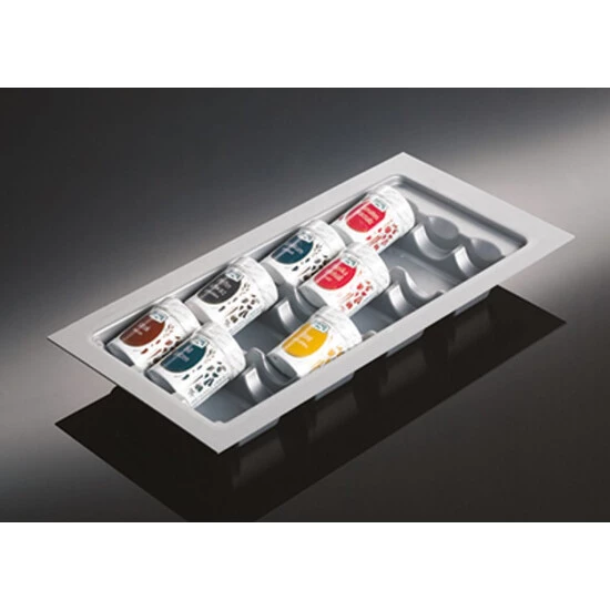 Naber Gewürzdoseneinsatz, 240 x 490 mm. Für 300er Schubladen, Rand einkürzbar, Farbe: silbergrau. Für Gewürzdosen im 12er Set, wobei kleine oder große Dosen verwendet werden können. Dosen werden schräg einsortiert. H 50 mm