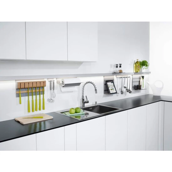 Ergänzt wird die Grundausstattung durch verschiedene Haken sowie Einzel- und Doppel-Rollenhalter. Außerdem gibt es einen ergonomisch konzipierten Messerblock und ansprechend gestaltete Köcher mit angeschrägter Basis, die nicht nur Küchenhelfer, sondern auch Kräutertöpfe aufnehmen.