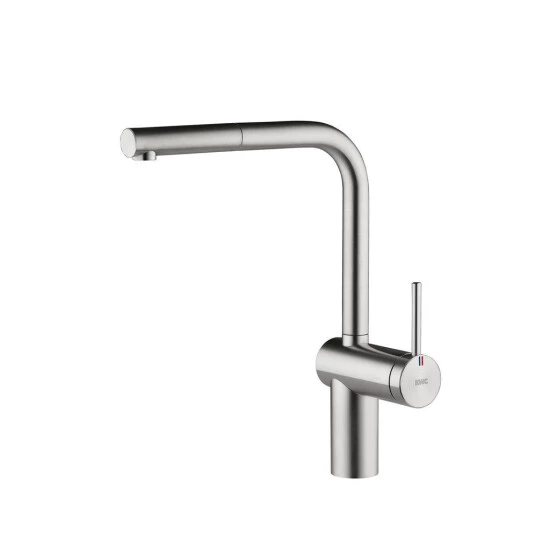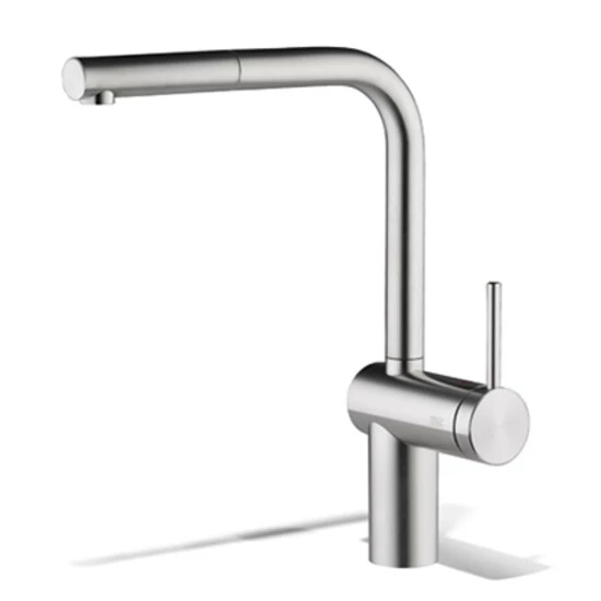 Naber, Livello 2E. Einhebelmischer, Edelstahl Schwenkbereich: 360°. Bohrdurchmesser: 35 mm. Mit schwenk-/herausziehbarem Auslauf, seitlichem Hebel und Keramikkartusche.