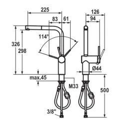 Die Edelstahl Küchenarmatur Livello hat einen Rechts positionierten Hebel. Der Einhebelmischer hat eine Kindersicherung indem Kaltwasser in der Vorderen Position aufgedreht ist. Es werden min 65mm von Wand zu mitte Tischbohrung benötigt. Es ist TouchProtect(Schutz vor Verbrennungen durch 2 Schalenprinzip). Der Auszugauslauf ist bis zu 600mm ausziehbar. Die Schlauchoberfläche passt zur Armaturoberfläche. Die Schlauchdurchführung ist 360° drehbar und ist mit EasyLock- einfache Auszugsbrausenrückführung ausgestattet. Die Armatur hat mit OptimalSpace einen großzügigen Wasch/ und Arbeitsbereich. Es ist eine KWC Steuerpatronen M35 H mit Keraikscheibentechnik verbaut. Die Auslaufmenge und die Temperatur sind stufenlos einstellbar. Angeschlossen wird die Armatur mit flexiblen 3/8′ Anschlussschläuchen und mit einem M33 x 1,5 Gewindestutzen befestigt. Die Tischbohrung muss d35 betragen.