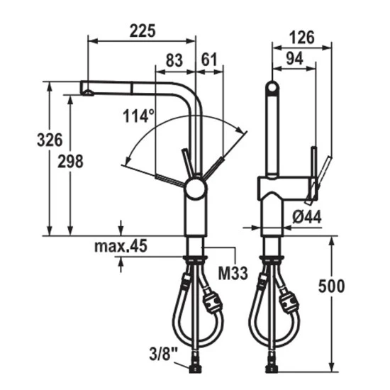 Flexible Anschlussschläuche 3/8“, Befestigung mit Gewindestutzen M33 x 1.5, Tischbohrung Ø 35 mm
