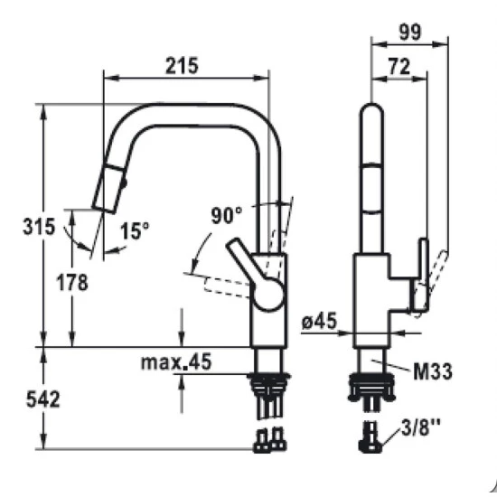 Der KWC luna e ganz chrom Hebelmischer hat einen rechts positionierten Hebel inklusive einer Kindersicherung. Der Abstand von der Wand zum mittleren Tischloch muss mindestens 25 mm betragen. Die Armatur verfügt über einen integrierten TouchProtect-Schutz gegen Verbrennungen nach dem Zweischalenprinzip. Die Ausziehbrause lässt sich ca. 400mm (schwarzer Gewebeschlauch) ausziehen. Der Einhebelmischer verfügt über QuickConnect (einfaches Schlauchverbindungssystem). Es ist eine M 35 S Regelpatrone mit Keramikscheibentechnik verbaut und die Temperatur sowie die Durchflussmenge sind stufenlos regelbar. Der Hebelmischer verfügt über flexible 3/8′ Anschlussschläuche und wird mittels QuickInstallation – Gewindeanschluss (M33 x 1,5) mit einer Feststellschraube befestigt. Die benötigte Tischbohrung beträgt d35 mm. Franke Artikelnummer: 115.0603.257, KWC Artikelnummer: 10.441.004.000FL
