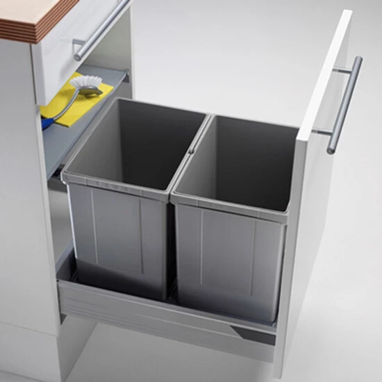 Naber Pullboy Vario 50 2. Abfallsammler, alu grau. Auszugstechnik für vorhandene Auszüge. Abfallvolumen: 34 (2×17) Liter Mit Antirutscheinlegematte und Komplettdeckel. Für alle gängigen Schubladen zuschneidbar. Zuschnittmaße der Matte in mm: max. B 462 T 565 min. B 311 T 456, mit nur 320 mm Einbauhöhe der ideale Raumsparer