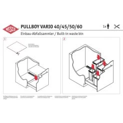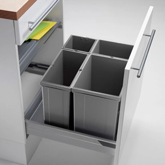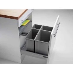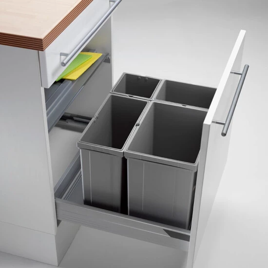 Naber Pullboy Vario 60 4. Abfallsammler, alu grau. Auszugstechnik für vorhandene Auszüge. Abfallvolumen: 41 (1×5+1×8+1×11+1×17) Liter Mit Antirutscheinlegematte und Komplettdeckel. Für alle gängigen Schubladen zuschneidbar. Zuschnittmaße der Matte in mm: max. B 565 T 565 min. B 468 T 456, mit nur 320 mm Einbauhöhe der ideale Raumsparer