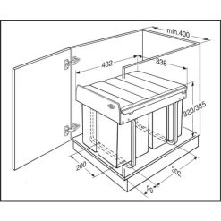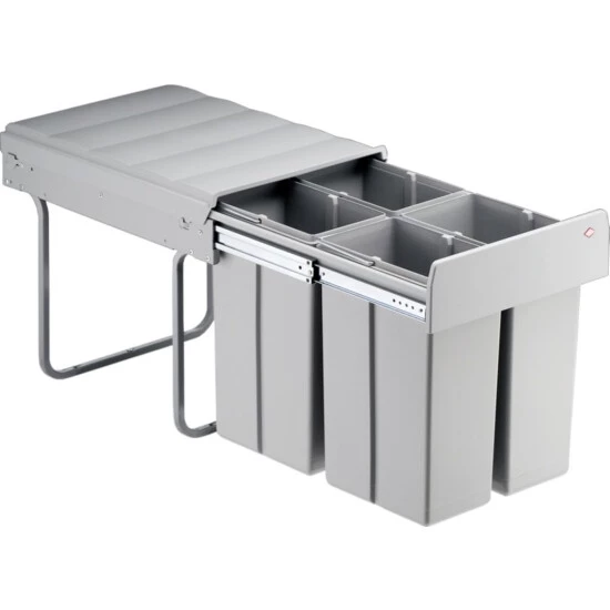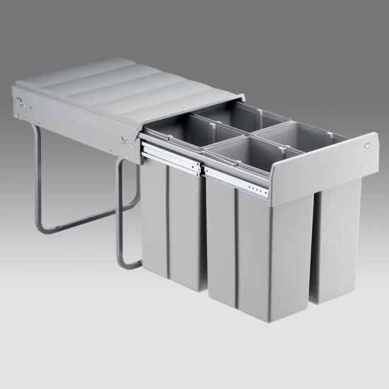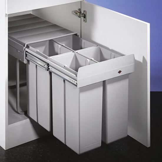 Der kompakte Abfallsammler von WESCO mit 4 Abfalleimern ist für Schrankbreiten ab 40 cm geeignet. Die Eimer verfügen jeweils über einen Henkel und sind Dank glatter Oberflächen leicht zu reinigen. Die Montage erfolgt auf dem Schrankboden in Drehtürenschränken.