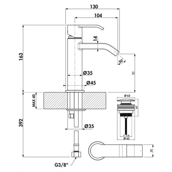 Einhebelmischer mit Keramikkartusche. Mit Ablaufgarnitur Klick-Komfort, Bohr-Ø 35 mm