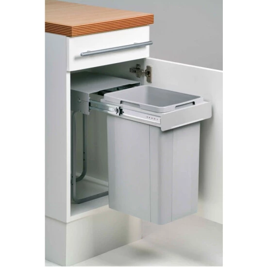 Abfallvolumen 26 oder 32 Liter, Technik: Vollauszug, Gestell/Führung silber, Gesamtdeckel alu grau, Montage: Schrankboden